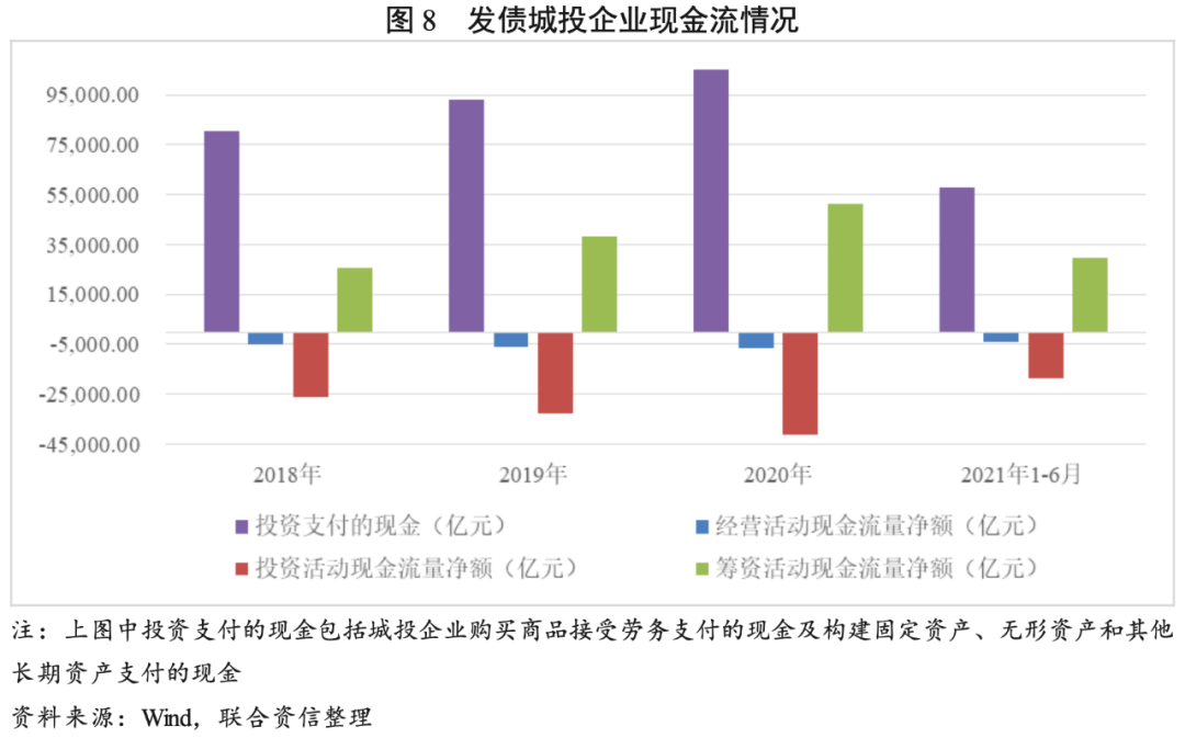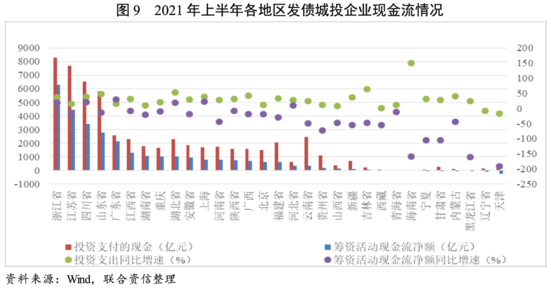 城投企業(yè)保持基礎(chǔ)設(shè)施建設(shè)投資力度,但不同地區(qū)基建投資增速有所分化。2021年上半年,城投企業(yè)投資力度加大,但凈融資規(guī)模收縮,資金壓力整體上升。