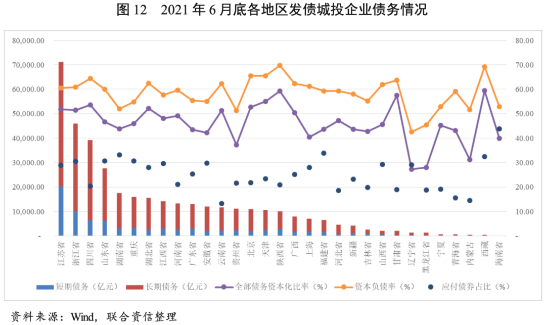具體來看,截至2021年6月底,江蘇、浙江和四川發(fā)債城投企業(yè)有息債務(wù)規(guī)模位列前三,東三省、西北部省份及海南省發(fā)債城投企業(yè)債務(wù)規(guī)模較小。福建、湖南、西藏、重慶、山東及浙江等地應(yīng)付債券占比均超過30%,對債券融資的依賴度相對較大;隨著到期債券逐步償還,云南、內(nèi)蒙古、青海、黑龍江、甘肅、寧夏等地債券融資占比下降至較低水平。債務(wù)負擔(dān)方面,陜西、甘肅、天津和四川等發(fā)債城投企業(yè)債務(wù)負擔(dān)較重,遼寧、黑龍江、內(nèi)蒙古、貴州和海南發(fā)債城投企業(yè)債務(wù)率水平較低,但實際債務(wù)負擔(dān)需結(jié)合具體城投企業(yè)資產(chǎn)質(zhì)量進行甄別分析。