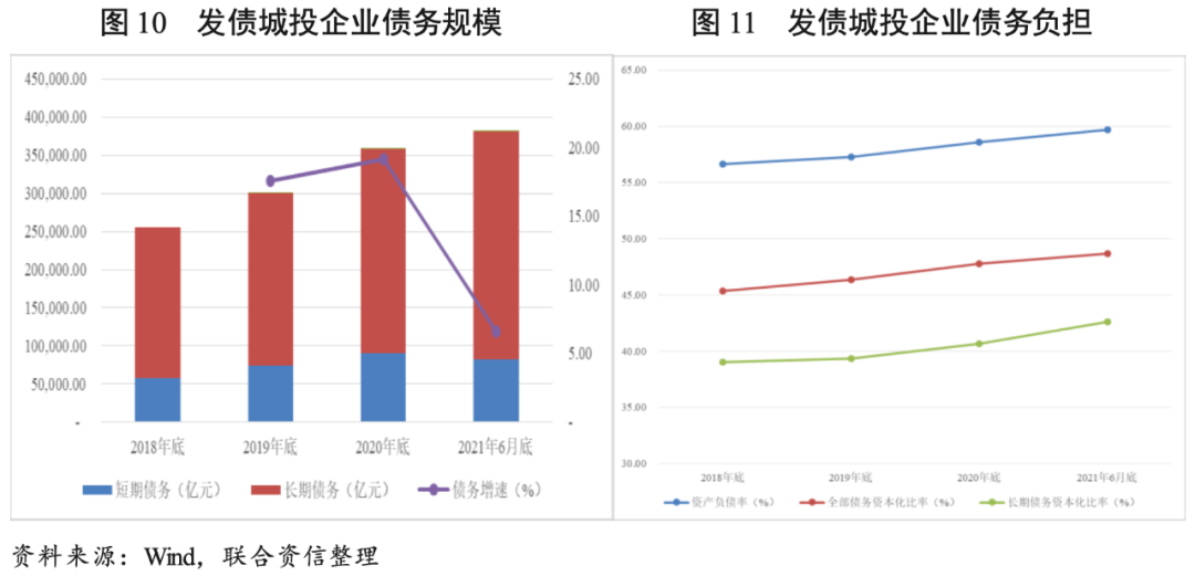 截至2021年6月底,發(fā)債城投企業(yè)有息債務(wù)規(guī)模超38萬億元;但隨著地方政府隱性債務(wù)監(jiān)管及城投企業(yè)融資政策趨嚴,城投企業(yè)債務(wù)增速較之前年度明顯放緩。與此同時,隨著債務(wù)的逐步置換,短期債務(wù)占比下降至21.70%。從債務(wù)負擔(dān)來看,發(fā)債城投企業(yè)負債水平持續(xù)提升,債務(wù)負擔(dān)加重。