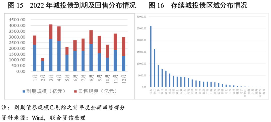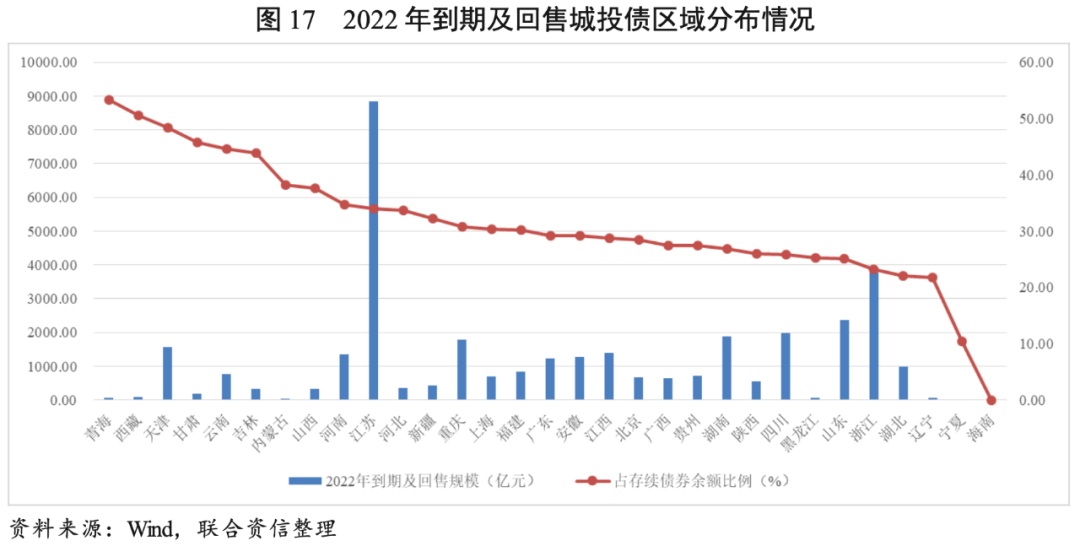從存續(xù)城投債到期規(guī)模來看,假設(shè)含回售選擇權(quán)的債券全額回售,2022年城投債到期及回售規(guī)模合計35260.99億元,償債壓力明顯大于2021年(約27000億元)。從兌付時間分布來看,2022年3月、4月和8月城投債到期及回售規(guī)模超過3500億元,集中償付壓力較大。區(qū)域方面,需重點關(guān)注天津、甘肅、云南等地城投債兌付壓力,并重點關(guān)注短期償債壓力大及出現(xiàn)逾期、欠息、擔(dān)保代償、非標逾期等負面事件尾部城投企業(yè)的信用風(fēng)險。