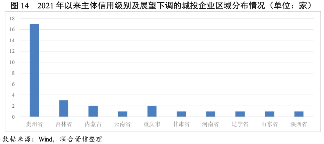 監(jiān)管趨嚴、融資政策收緊對政府債務(wù)負擔(dān)較重地區(qū)的弱資質(zhì)城投企業(yè)產(chǎn)生更大負面影響。2021年以來,主體信用等級及展望下調(diào)的城投企業(yè)數(shù)量明顯增加,包括主體信用等級下調(diào)10家,展望下調(diào)20家,下調(diào)原因主要包括區(qū)域經(jīng)濟及財力下滑,短期償付壓力大,出現(xiàn)欠息、代償以及非標逾期等風(fēng)險事件。其中,主體信用級別下調(diào)至AA-的主體居多,占50.00%;從地域分布看,貴州省主體信用級別及展望下調(diào)的城投企業(yè)最多(共計17家),其次為吉林省(共計3家)。