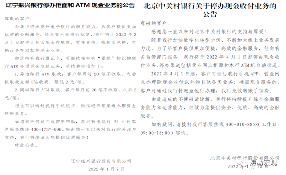 具體看,2022年1月7日,遼寧振興銀行發布《停辦柜面和ATM現金業務的公告》,明確自2022年3月1日起將停辦柜面現金存取款、零錢兌換、殘損幣兌換、自助設備存取款等現金業務。隨后1月28日,北京中關村銀行亦發布《關于停辦現金收付業務的公告》,明確自2022年4月1日起停辦現金收付業務,停辦渠道包括營業網點柜面和本行ATM機自助渠道。