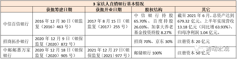(二)第二類互聯網銀行則為法人直銷銀行。法人直銷銀行是傳統銀行與互聯網公司相結合的產物。目前已有三家法人直銷銀行成立(其中兩家已開業),分別為中信百信銀行、招商拓撲銀行(已獲批籌建)和中郵郵惠萬家銀行(已獲批開業)。某種程度上來說,郵儲銀行和招商銀行接連被批準籌建直銷銀行可能是一個信號,畢竟這是五年來法人直銷銀行設立首次被放開。