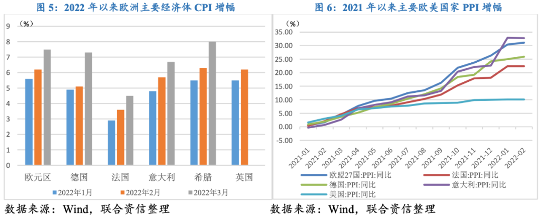 本輪通脹壓力受到貨幣流動性過剩與供需結(jié)構(gòu)性失衡的雙重影響。一方面,新冠疫情暴發(fā)后各國積極救市,釋放出空前流動性并造成全球貨幣超發(fā),僅2020年全球流通中的廣義貨幣就增加了12.7萬億美元,再疊加貨幣乘數(shù)效應(yīng),估計(jì)全球釋放的流動性增加了超過100萬億美元,流動性過剩推升全球通脹壓力走高。另一方面,本輪通脹壓力還受到供需失衡的結(jié)構(gòu)性因素影響。新冠疫情暴發(fā)初期受隔離政策影響,需求端斷崖式萎縮;隨著疫情得到一定控制,被壓抑的需求得到釋放,但受全球供應(yīng)鏈斷裂以及基礎(chǔ)能源價格上漲等因素影響,供給端生產(chǎn)動力不足,供求失衡帶動基礎(chǔ)物價上漲。尤其是俄烏戰(zhàn)爭沖突爆發(fā),對全球大宗商品價格以及主要供應(yīng)鏈均造成顯著沖擊,進(jìn)一步帶動全球通脹壓力走高。歐元區(qū)3月消費(fèi)者價格指數(shù)(CPI)同比上漲7.5%,較2月上漲2個百分點(diǎn),其中能源產(chǎn)品價格同比上漲44.7%,是推動該地區(qū)通脹上升的最主要推手。分國別來看,德國、法國、意大利和希臘的CPI分別升至7.3%、4.5%、6.7%和8.0%(見圖5),分別創(chuàng)自1981年、1997年、1991年和1994年以來新高。