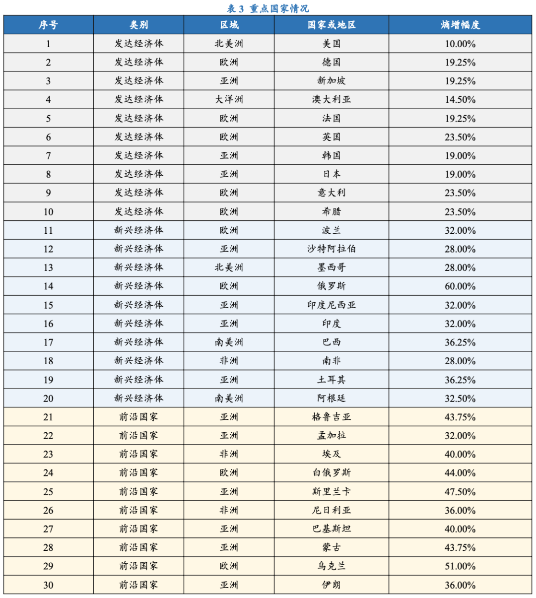 利用專家意見對美聯(lián)儲加息、俄烏戰(zhàn)爭沖突以及通脹壓力走高三種熵增場景進(jìn)行評價,并以此為基礎(chǔ)判斷計(jì)算重點(diǎn)國家的熵增程度,搭建后疫情時代下的各國秩序分布。同時,與舊格局進(jìn)行比較,找出其中跨區(qū)域風(fēng)險變動的國家。