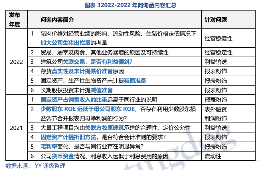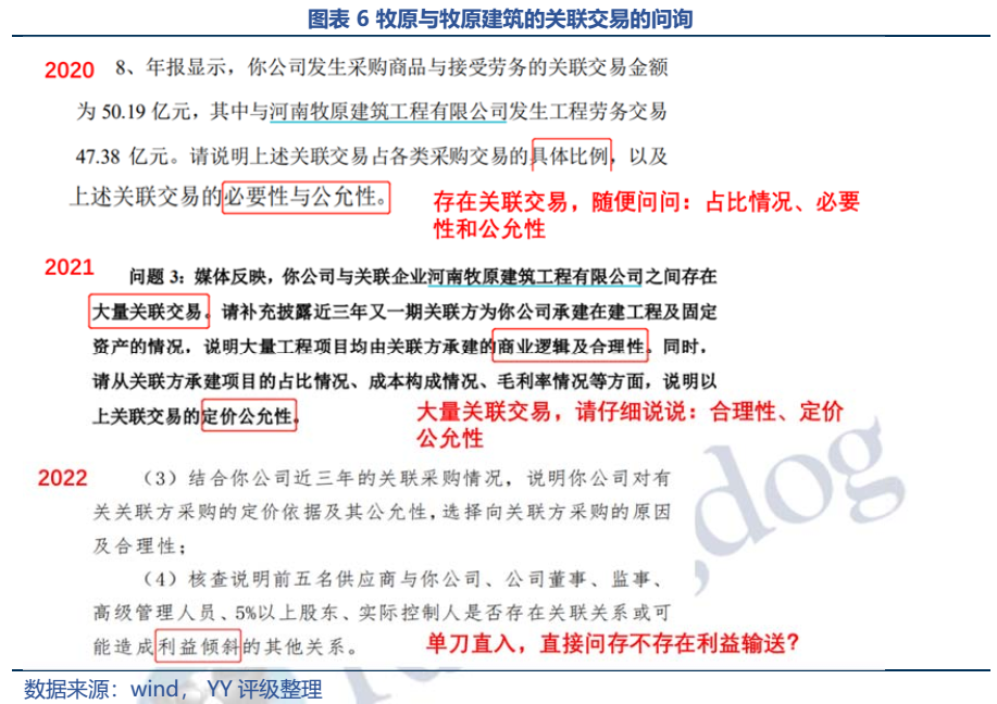 牧原與牧原建筑的關聯交易年年都被問詢,雖然是老生常談,但是今年言辭更加犀利。20、21年的問詢函是點到為止,側重點是補充說明關聯交易的明細、必要性、公允性,21年報問詢直接提出是否存在利益傾斜?