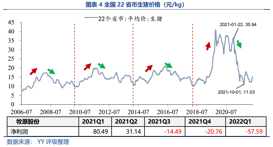 21年2月以來生豬出欄價格一路下行,21年10月最低跌至11元/千克左右,此后一直在10-15元/千克徘徊,跌破了部分企業的成本價,牧原從21年Q3開始也出現了持續虧損。