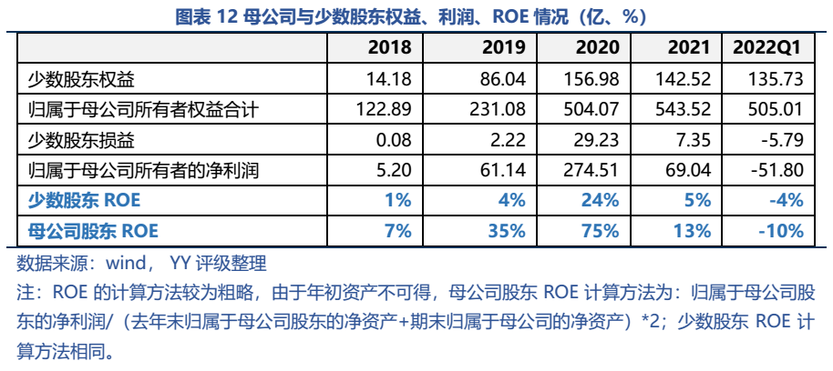 而22年Q1出現虧損時,少數股東ROE為-4%,明顯小于母公司股東的-10%。這些少數股東出同樣資金,卻做著掙錢少、賠錢也少的合伙生意?