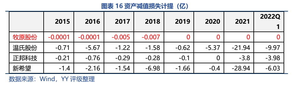 從資產減值損失來看,牧原自2014年上市以來幾乎沒有計提過資產減值損失,2015-2019年雖有計提,但數字小到可以忽略不計,而最近三年減值金額則直接為0。同業均有計提,唯獨公司無需計提?