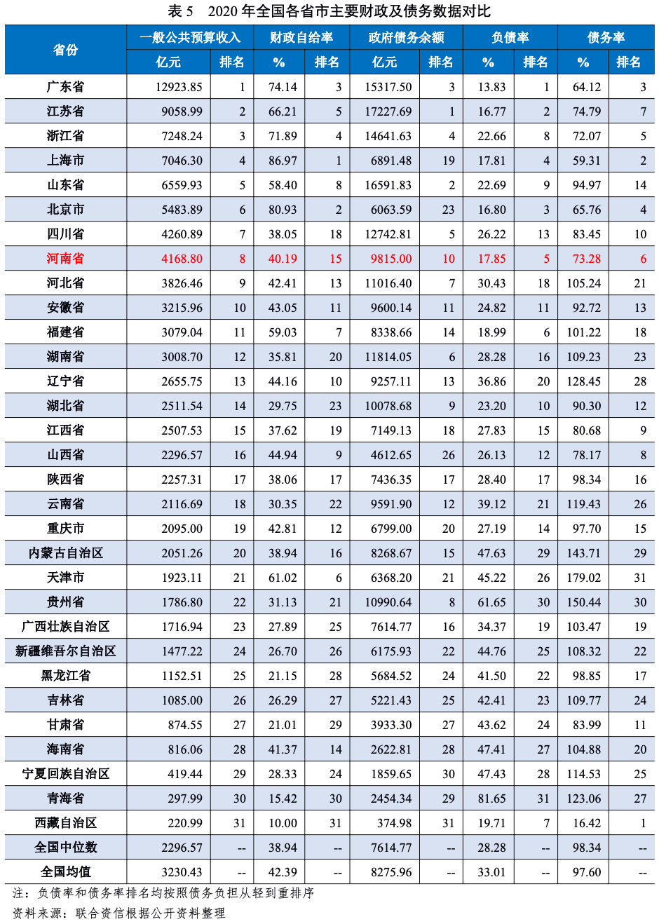 河南省位于我國中東部、黃河中下游,是全國重要的交通樞紐和物資集散地,經濟發展水平較好,近年來經濟總量居全國前列,人均GDP排名全國中下游。2018-2020年,河南省經濟增速及固定資產投資增速均有所放緩,但產業結構持續優化,經濟發展態勢良好。2021年以來,受洪澇災害和“新冠”肺炎疫情影響,前三季度主要經濟指標增速出現不同程度回落。2020年,河南省一般公共預算收入全國排名第八位,一般公共預算收入穩定性較強但財政自給能力一般,政府性基金收入和上級補助收入是河南省綜合財力的重要支撐。2020年,河南省政府負債率和債務率在全國各省(自治區、直轄市)中分別排名第5位和第6位,政府負債水平相對較低,債務負擔尚可。