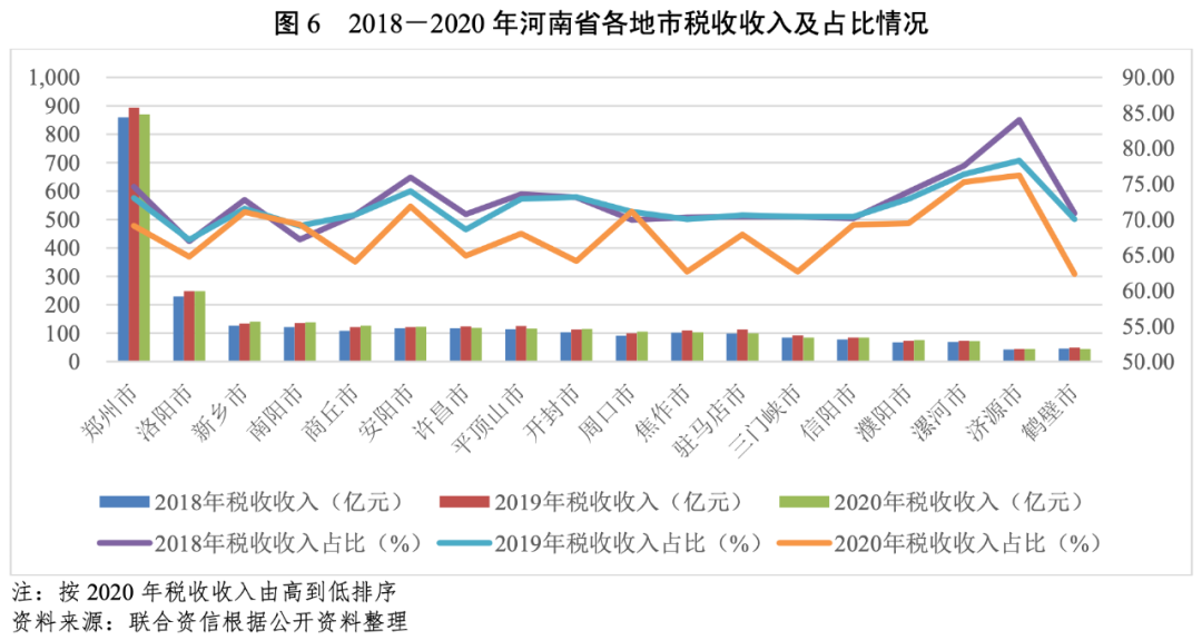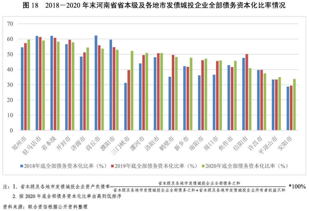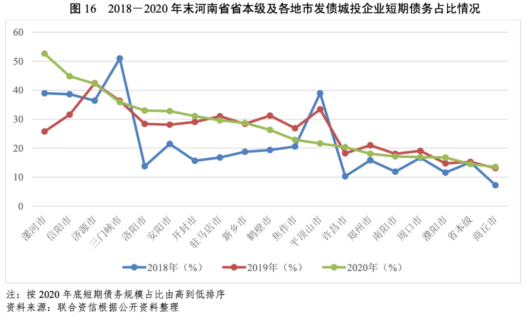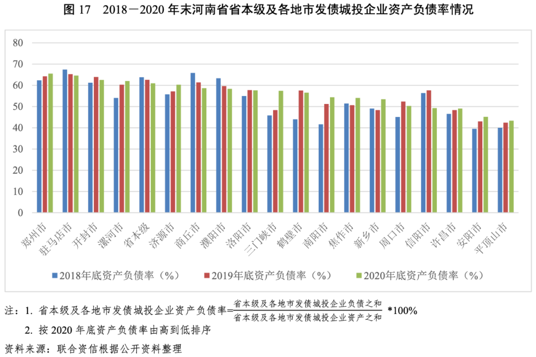 從發債城投企業全部債務與“發債城投企業全部債務+地方政府債務”的比值看,截至2020年底,9個地市比值超過50%,其中,鄭州市和三門峽市比值分別為70.19%和69.45%,整體處于較高水平。