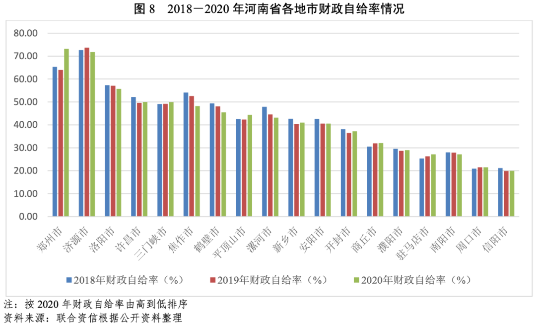 財政自給率方面,2020年,鄭州市財政自給率最高,為73.20%,除鄭州市和濟源市以外,其他地市財政自給率均在60%以下,其中信陽市最低,僅為19.96%。從財政自給率變化情況來看,2018-2020年,除鄭州市、三門峽市、平頂山市、商丘市、駐馬店市和周口市以外,其他地市財政自給率均呈現不同程度下降。總體看,河南省各地市財政自給率差距較大,財政自給能力整體較弱。