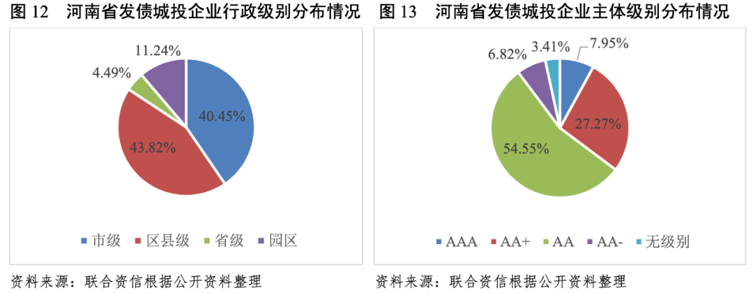 從發債城投企業主體信用級別分布看,河南省有存續債券的89家城投企業中,有存續主體級別的城投企業共86家。其中,主體級別為AAA的城投企業共7家,集中在省本級(4家)和鄭州市(3家);主體級別為AA+的城投企業共24家,除整體實力較弱的鶴壁市、信陽市、濮陽市、安陽市和漯河市共5家地級市沒有主體級別為AA+的城投企業以外,其余12家地級市及濟源市均有主體級別為AA+的城投企業,其中,主要分布于鄭州市(10家)、洛陽市(2家)和周口市(2家);主體級別為AA的城投企業共48家,占河南省發債城投企業(有存續主體級別)總數的55.81%;主體級別為AA-的城投企業共7家,全部為區縣級和園區級城投企業。整體看,河南省高信用級別(AA+和AAA)城投企業主要集中于省級和鄭州市,AA級城投企業占比最高。