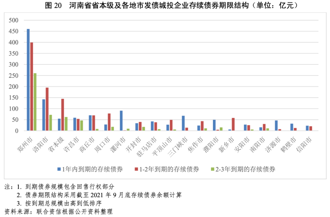 從企業層面看,河南省及下轄18個地市(含省直管市濟源市)均有發債城投企業,發債城投企業主要分布于省會鄭州以及洛陽、許昌、開封和平頂山等省會周邊地市,發債城投企業主體信用級別以AA級為主,高級別城投企業集中在省本級及鄭州市。2020年,河南省發債城投企業債務負擔有所加重,其中漯河市、信陽市和濟源市等地市短期流動性壓力較大,各地市發債城投企業債務償還對外部籌資依賴仍然較大。截至2021年9月底,鄭州市、洛陽市和省本級發債城投企業未來三年到期債券規模大,其中鄭州市發債城投企業一年內集中兌付壓力較大。河南省省本級及各地市“發債城投企業全部債務+地方政府債務”規模差異較大,省本級和鄭州市規模遠超其他地市,地方綜合財力對“發債城投企業全部債務+地方政府債務”保障能力偏弱的區域主要為三門峽市、濟源市、許昌市和開封市,需關注面臨集中償付壓力和債務負擔較重的區域內城投企業的信用風險。