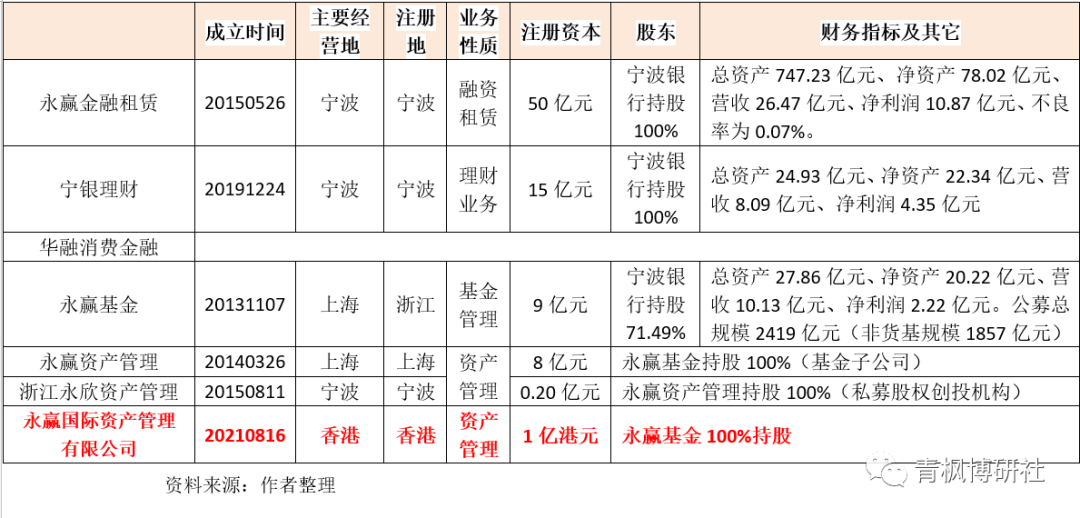 1、2021年8月16日,證監會批復同意永贏基金在香港全資設立永贏國際資產管理,意味著寧波銀行通過永贏基金實現了在香港的布局。