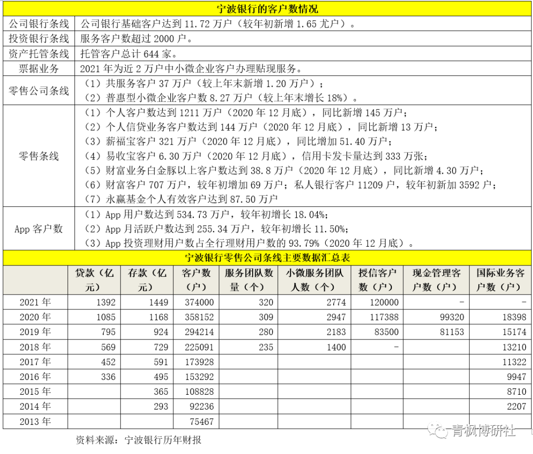 目前寧波銀行的客戶數已經實現了較快成長,并取得了不錯成效,其公司銀行客戶數分別達到11.72萬戶(同比新增1.65萬戶)、投行業務服務客戶超2000家、私行客戶達到12974戶(較年初增加5357戶)、托管客戶數達到644家。